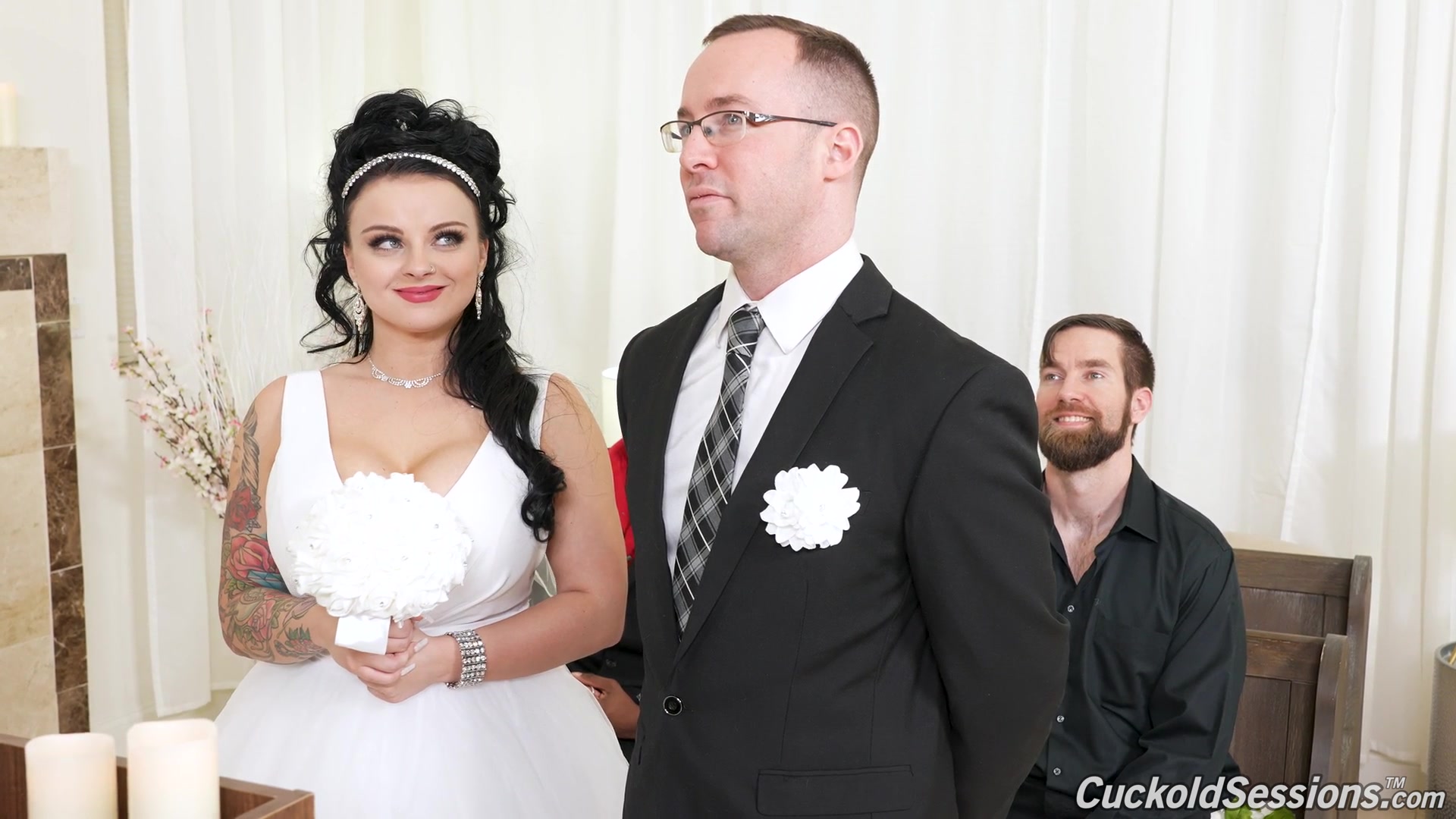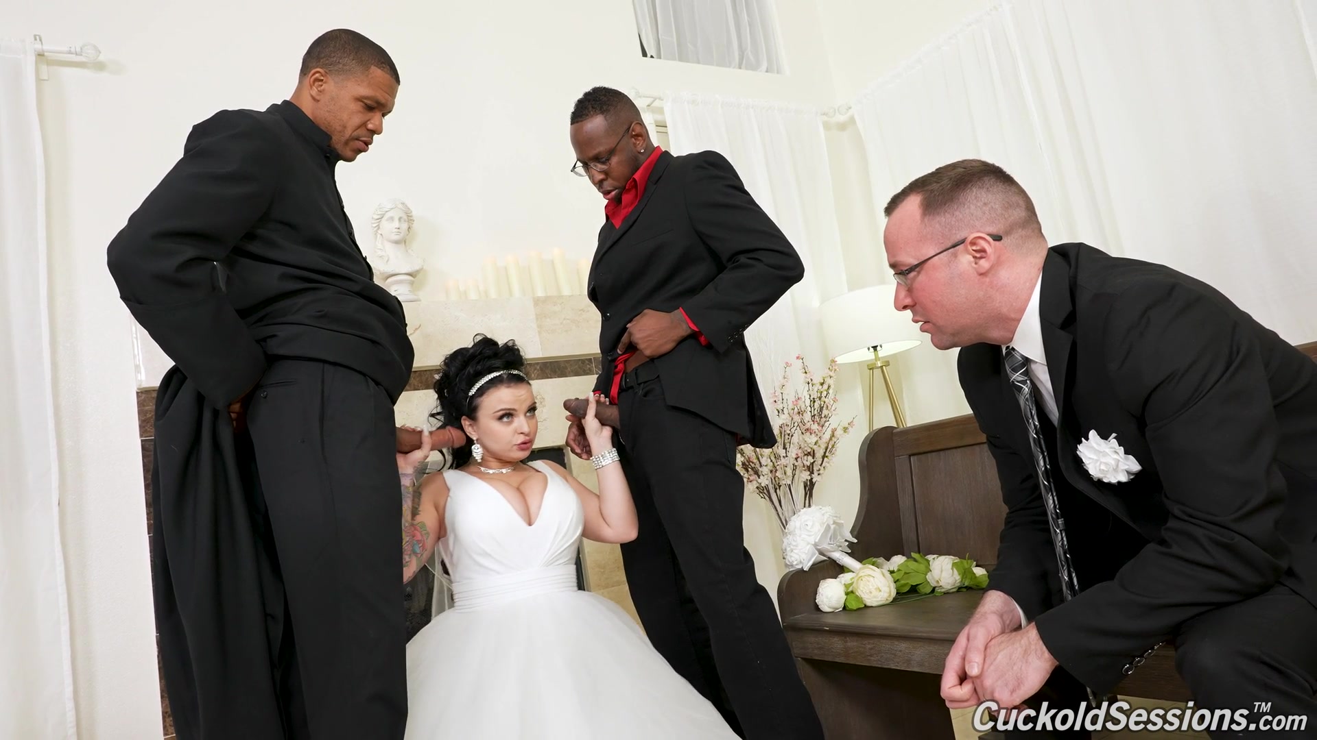Описание: Красивая пышная брюнетка в свадебном платье сегодня выходит замуж. В качестве мужа она нашла долбоеба, всегда готового мириться с тем, что она будет изменять ему всю свою жизнь. Дело в том, что толстушка имеет бешенство матки и трахаться хочется постоянно, что не готов ей дать муженек. И вот идет процессия, священник зачитывает молитву, муж надевает своей законной жене обручальное кольцо в присутствии свидетелей, все как полагается в день Свадьбы, но тут толстушку понесло и она захотела секса прямо в зале ЗАГСа. 2 темнокожих парня сделали свое дело и обкончали невесте большую грудь спермой, которую она дала слизать муженьку. Куколд порно рогоносцы смотрим на ХУЯМБА!