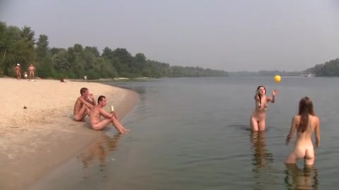 Молоденькие сучки разделись до гола на пляже и играют в воде в мячик.